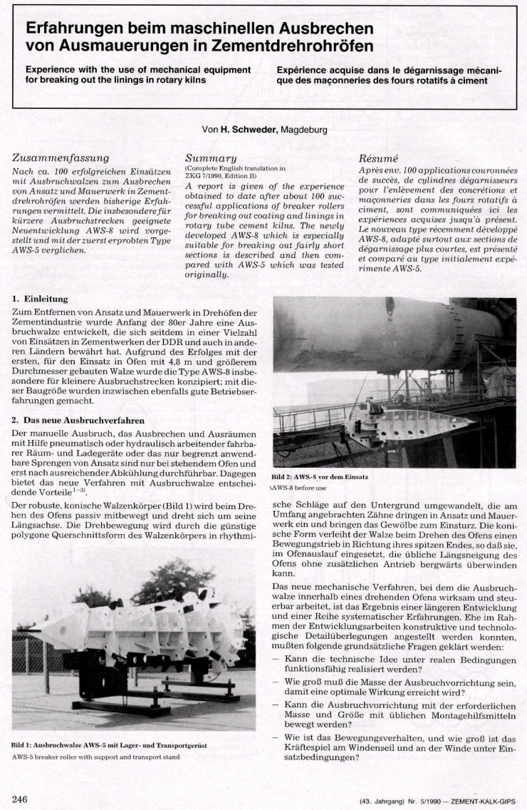 ![]() ![]() Im Rationalisierungsmittelbau des SBKM wurden neben reinen Selbsthilfe-Einsätzen, wie der Bau von Schornsteinwinden auch durchaus fachspezifische Arbeit geleistet. Ein solches Beipiel ist die Abbruchwalze für das Ausbrechen der verschlissenen feuerfesten Auskleidung von Drehrohröfen. Damit hätten auch nach der Wende gute Geschäfte gemacht werden können, aber die zögernde internationale PR-Arbeit und die wirtschaftlichen Umwälzungen zur Wende habe das leider verhindert. Selbst der obige Artikel in der bundesdeutschen Fachzeitschrift "Zement-Kalk-Gips" ist durch übertriebene Sicherheitsbedenken und ein ausuferndes Kontrollsystem im SBKM zu Wendezeiten (!) Monate zu spät erschienen. Erstaunlich, daß schon im Oktober 1988 ein US-Patent angemeldet wurde. Das Abbruchgerät hat jedenfalls in DDR-Zementwerken ernorme Effekte erbracht. Mit dem Verschwinden vieler DDR-Betriebe ist auch viel wertvolles technisches Wissen verlorengegeangen. Die Fotos bzw. Repros auf der linken Seite, von oben nach unten: Fotos