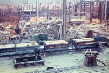 Porzellanwerk Kahla, im Hintergrund sind 4 Tunnelöfen im Bau, im Vordergrund erhalten die Ofenwagen ein feuerfestes Plateau. Diese Arbeiten wären eigentlich später dran gewesen, aber damit konnte man gute Ergebnisse bei der Planerfüllung erreichen (Planerfüllung zum Schaden der Volkswirtschaft). 600 Wagen waren zu betonieren - sie standen dann überall im Wege und besser wurden sie durch laufende Umsetzung auch nicht. (Foto von 1960) |